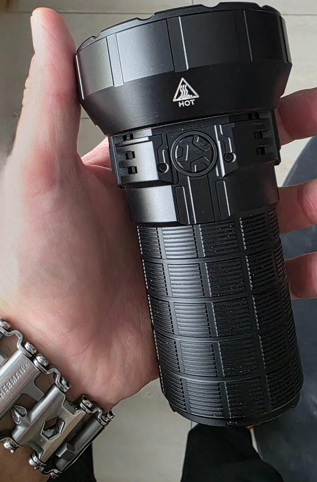 Der abnehmbare Griff besteht aus einer Aluminiumlegierung, die mit einer wärmeisolierenden Beschichtung überzogen ist. Auch wenn sich das Gehäuse der IMALENT MS12 LED-Taschenlampe während des Gebrauchs erwärmt, sorgt der durchdachte Griff für einen kühlen und bequemen Halt. Die Integration eines Doppelschalters erhöht den Benutzerkomfort und sorgt für eine einfache Handhabung.